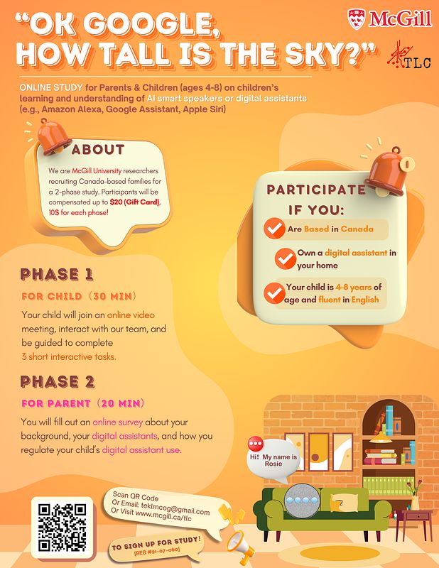 The study will be conducted in two phases. First, we will request your child to join an online video meeting (Webex) to conduct the study. Your child will be asked to interact with a research assistant and be guided to complete 3 short interactive tasks for about 30 minutes. Second, we will request you to fill out an online survey and questions will include demographic information (age, education, occupation etc.) as well as information on any digital assistants in your home currently and questions about how you regulate your child’s digital assistant use.