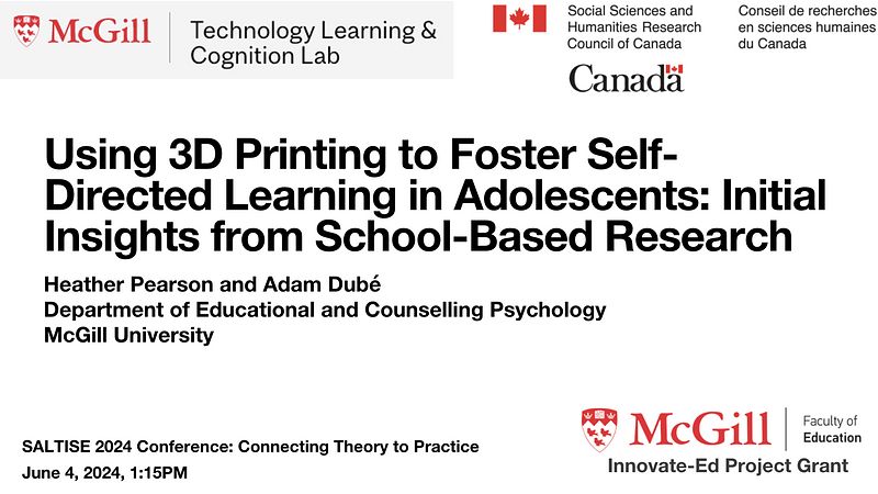 TLC Member Heather Pearson presents initial findings from her dissertation work “Using 3D Printing to Foster Self-Directed Learning in Adolescents: Initial Insights from School-Based Research” as a talk at SALTISE.