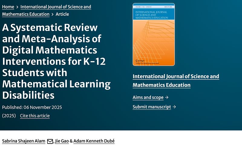 Alam, S. S., Gao, J., & Dubé, A. K. (2025). A Systematic Review and Meta-Analysis of Digital Mathematics Interventions for K-12 Students with Mathematical Learning Disabilities. International Journal of Science and Mathematics Education.https://doi.org/10.1007/s10763-025-10617-z