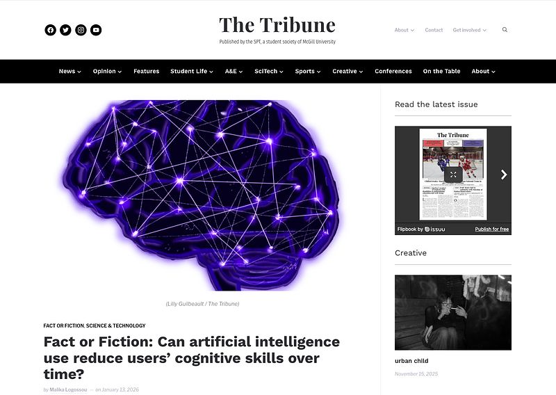 We are pleased to share that Nandini Asavari Bharadwaj was interviewed by The Tribune, a student-run newspaper at McGill University, on the effects of Generative AI (Gen AI) use on cognitive skills. You can read the interview here